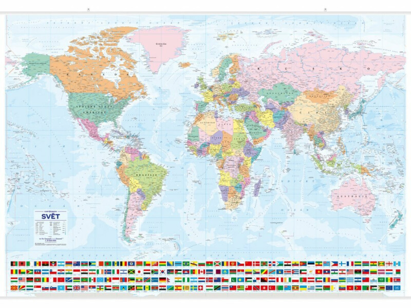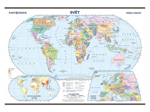 Přepracované vydání politické mapy světa.Na mapě v novém plochojevném zobrazení naleznete zobrazené státy světa, jejich hlavní města a vybraná největší města světa (stav k roku 2023).*****Mapa je nově doplněna vyobrazením hustoty zalidnění. •Svět v měřítku 1 : 26 000 000 v administrativním dělení•Výřezy Evropy v měřítku 1 : 13 000 000•Mapa hustoty zalidnění v měřítku 1 : 70 000 000•Laminovaná mapa s dřevěnými lištami nahoře i dole• Rejstřík k nástěnné mapě ke stažení na: www.skolnimapy.cz.